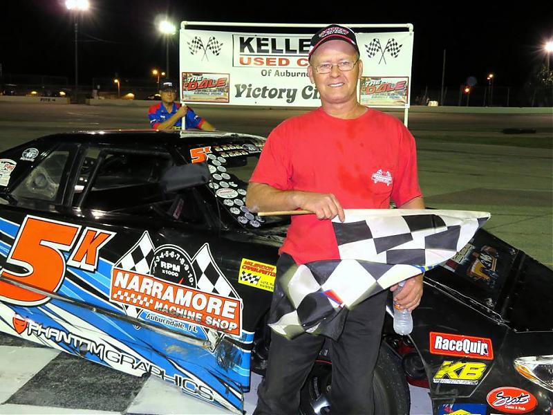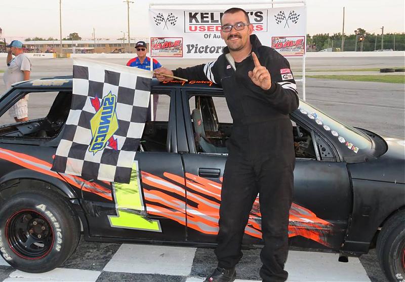 Travis Todd led all the way to claim his first-ever win at Auburndale in taking the Scrambler feature. Although his teammate Danny Burchfield brought out the red flag blowing an engine mid-race, Todd streaked to a fairly comfortable win over Chuckie Harrison and his dad Chuck Harrison. All three were driving Saturns. Wayne Dunnavent, Jr. was fourth in his first race here trailed by Burchfield, Serena Young, Trevor Appling and Joe Mezenbach (all DNF’s)