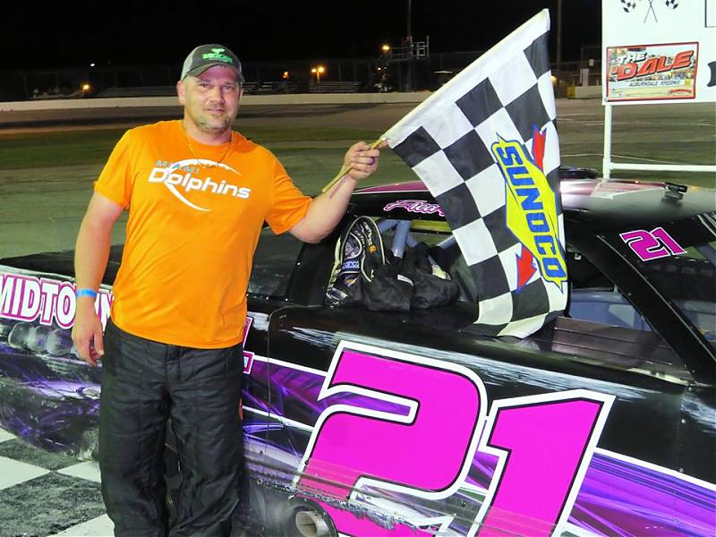 The Open Wheel Modifieds were scheduled to run a big 75-lap contest but when only seven cars showed up, the drivers and track officials agreed to cut the race to 40 laps with only a small cut in the purse.